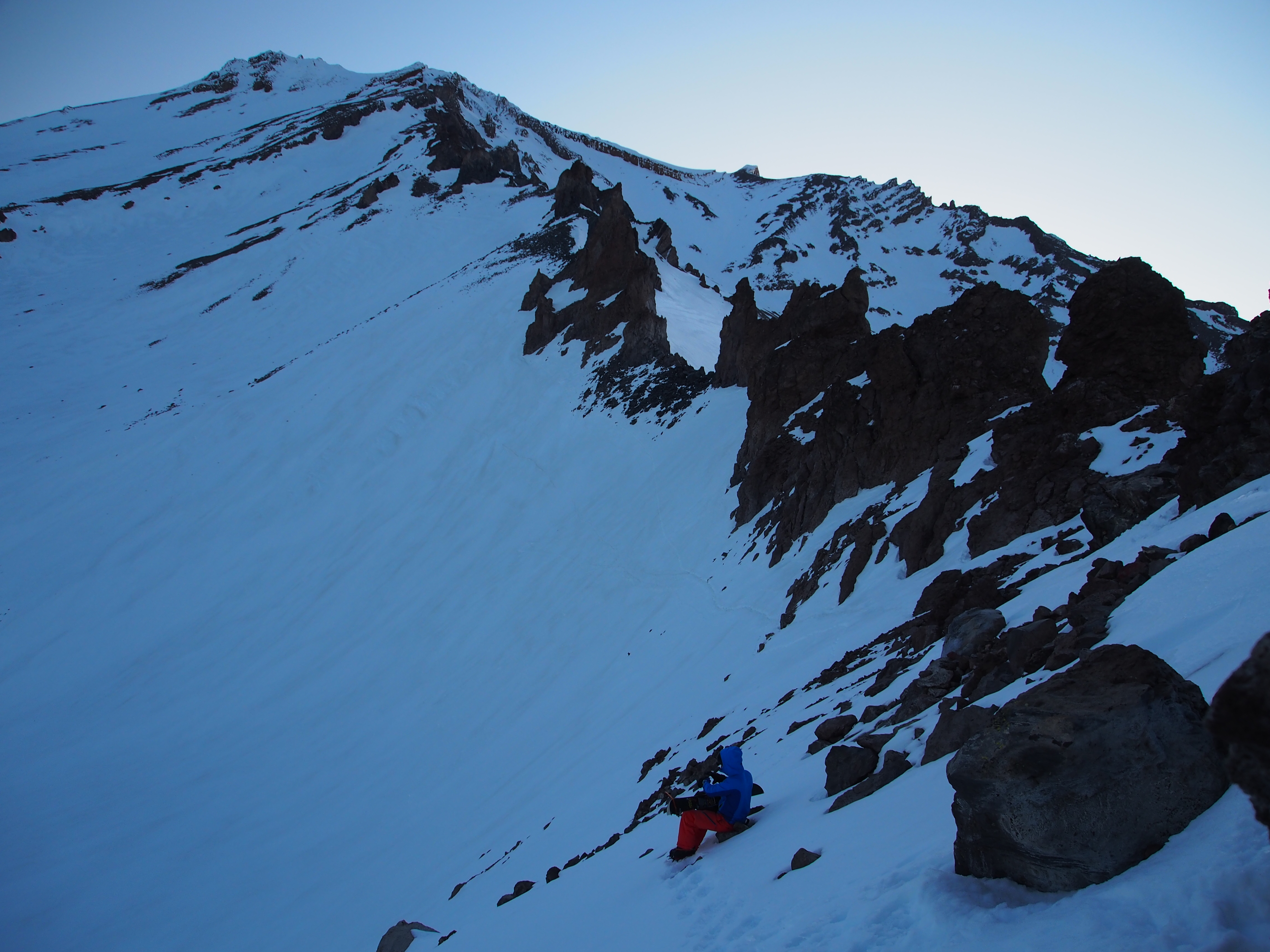 : We had some route finding issues. We missed horse camp, which caused us to gain the ridge later and higher than planned. Then we made the mistake of following a more established bootpack onto the west face, rather than sticking to the ridge (where there was not much of a bootpack). This snafu lead to us climbing up a steep and rather dangerous icy face to get back onto the ridge (serious no-fall zone). On the plus side, because of our error we avoided the infamous catwalk section. Lessons learned: do more pre-climb route study and bring GPS.