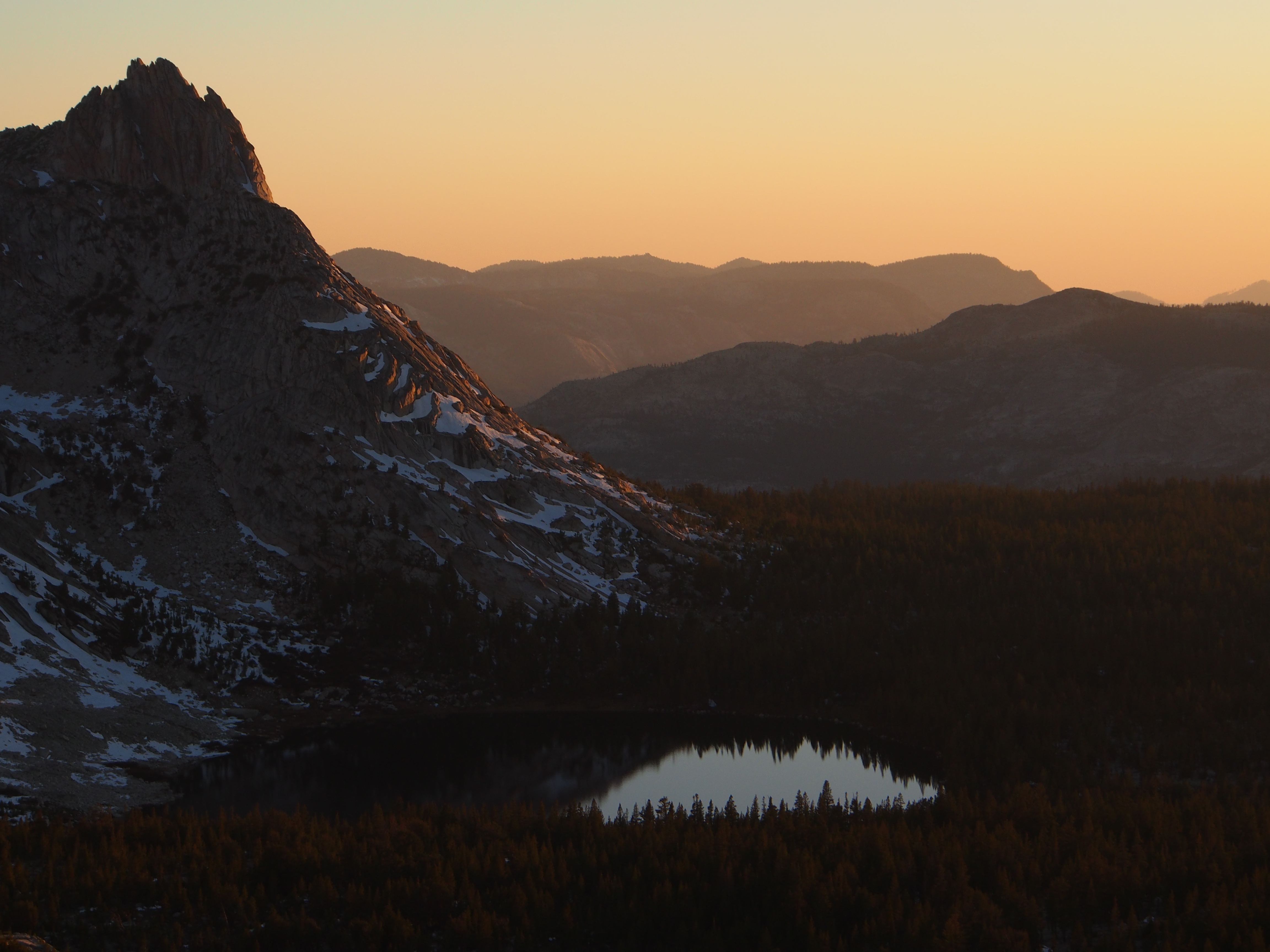 With a lot of summer schedule chaos, it was tough to get away this weekend, but we managed to squeeze in a quick backcountry trip. Although we’ve been to a few of the classic Yosemite areas, we hadn’t yet made it up to Tuolumne, the home of many must-do routes . So, we took off late on Friday with the goal of making it to one of the campgrounds just outside Yosemite. We ended up at the Sweetwater campground off CA-120. Despite the killer mosquitoes, it had everything we needed. There were available campsites (even with our 9pm arrival), and we had enough time to set up camp, eat dinner, enjoy a quick fire, and get some rest. It also put us fairly close to the park, so in the morning we only had to drive an hour or so to get into the park, get a backcountry permit, and get to the trail head.