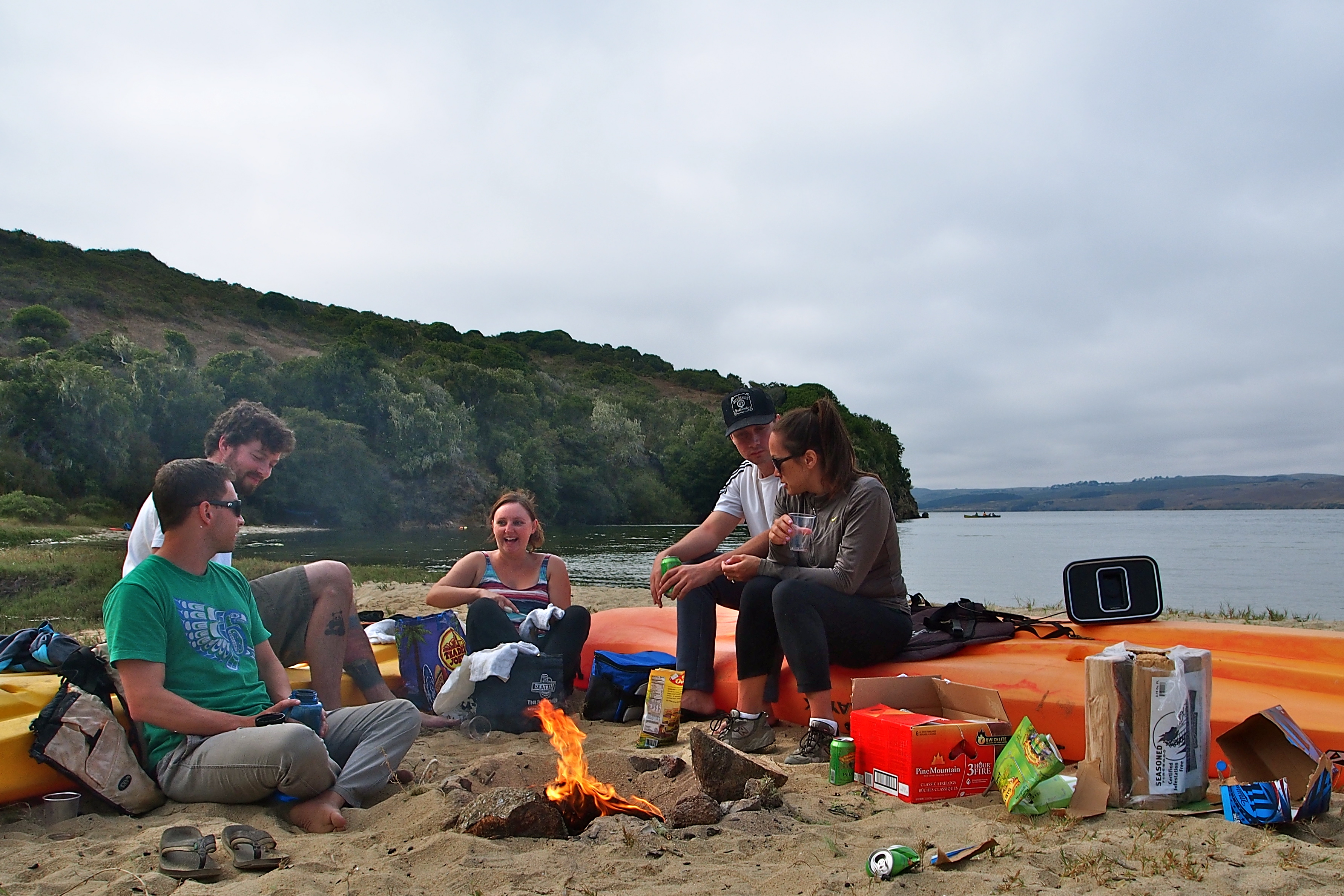 A short drive from the bay area, this trip is a must (stopping at the Paper Mill Creek Saloon is also a must). On Saturday morning we drove up to the Point Reyes Ranger Station (~1 hr drive from our place in the East Bay) to pick up our backcountry camping permit and a fire permit. We then met the rest of our crew at Blue Waters Kayaking in Marshall, CA at 10am (~15 min drive from Pt Reyes station). Here was our set up: we had two people in a canoe (which was borrowed from a friend), two in an open double kayak (rented), and two in individual open kayaks (also rented). The dudes at Blue Waters were pretty cool about their whole operation (they clearly have a monopoly on the market…), but it was chaotic on Saturday morning since they were dealing with multiple groups. They also made it clear that we were not supposed to launch the canoe from their beach since we didn’t rent it from them (liability blah blah blah), but they made an exception for us which was much appreciated. The canoe allowed for a lot of storage space so that we could bring the essential stash of beer, firewood, and gear. The single kayaks had a decent amount of storage space as well, so we were able to put water, backpacks, and sleeping bags in these. Overall we had more than enough room since we had packed pretty light.