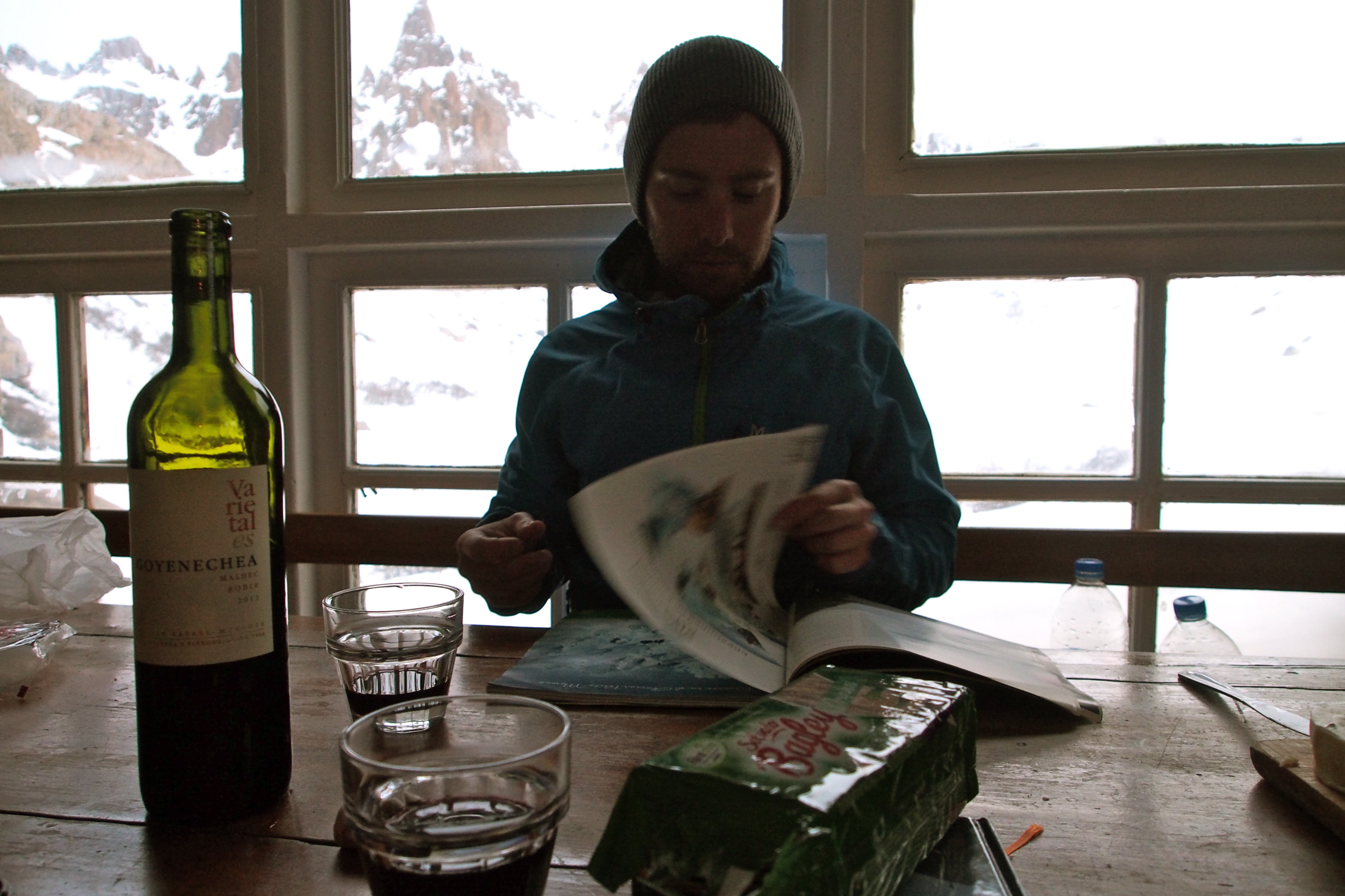 We indulged in a few more days of resort riding, steak-eating, and wine-drinking before taking off for Refugio Frey. We left early on Sunday and caught the bus up to Catedral. We were on the trail to Frey by 10:30am. It was about 4-5 miles of hiking, not touring, to the Refugio since the snow level was fairly high. We were both feeling suprisingly beat, but we made it to there around 2 or 3pm, ate a quick lunch, then headed out for some late day touring. Although we had brought most of our backcountry gear, we quickly realized that we should have brought crampons and ice axes. The upper chutes were too icy for our setup, so we were limited to the lower half of the surrounding terrain. Nonetheless, we still managed to have an excellent time. The cirque around the refugio is an amazingly beautiful place to be, an obvious destination for skiers and climbers (we’ll be back with the climbing gear someday). The host at the refugio, Sandy, made us an excellent dinner, and we enjoyed some cards and wine before crashing. There were 8 total guests staying there that night, and although it can sleep ~20, it was cozy with 8 and would be crowded with many more. The sleeping area was pretty grimy, and although they provide some sleeping bags, we were wishing we had our own (but at least we had brought sleeping bag liners).