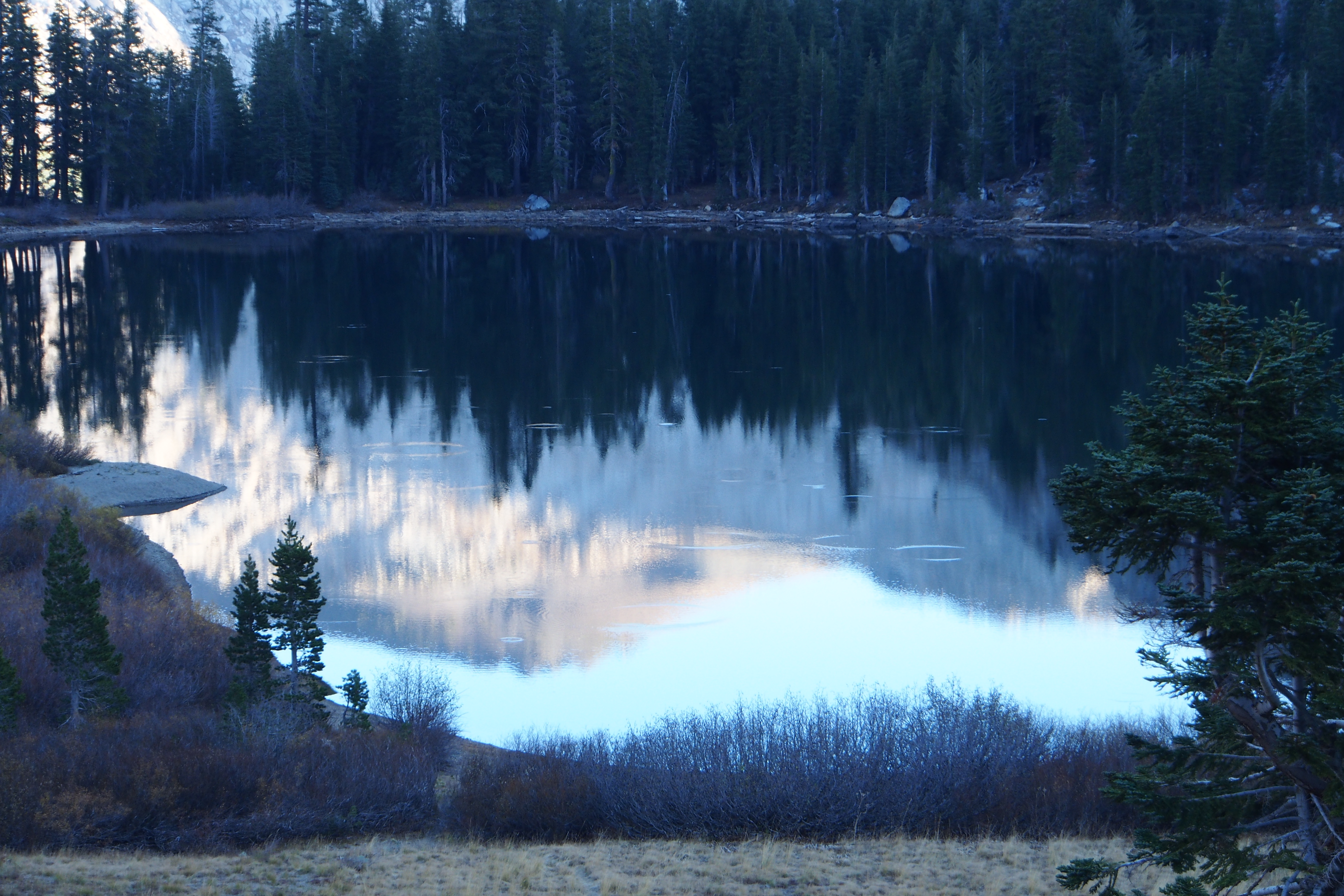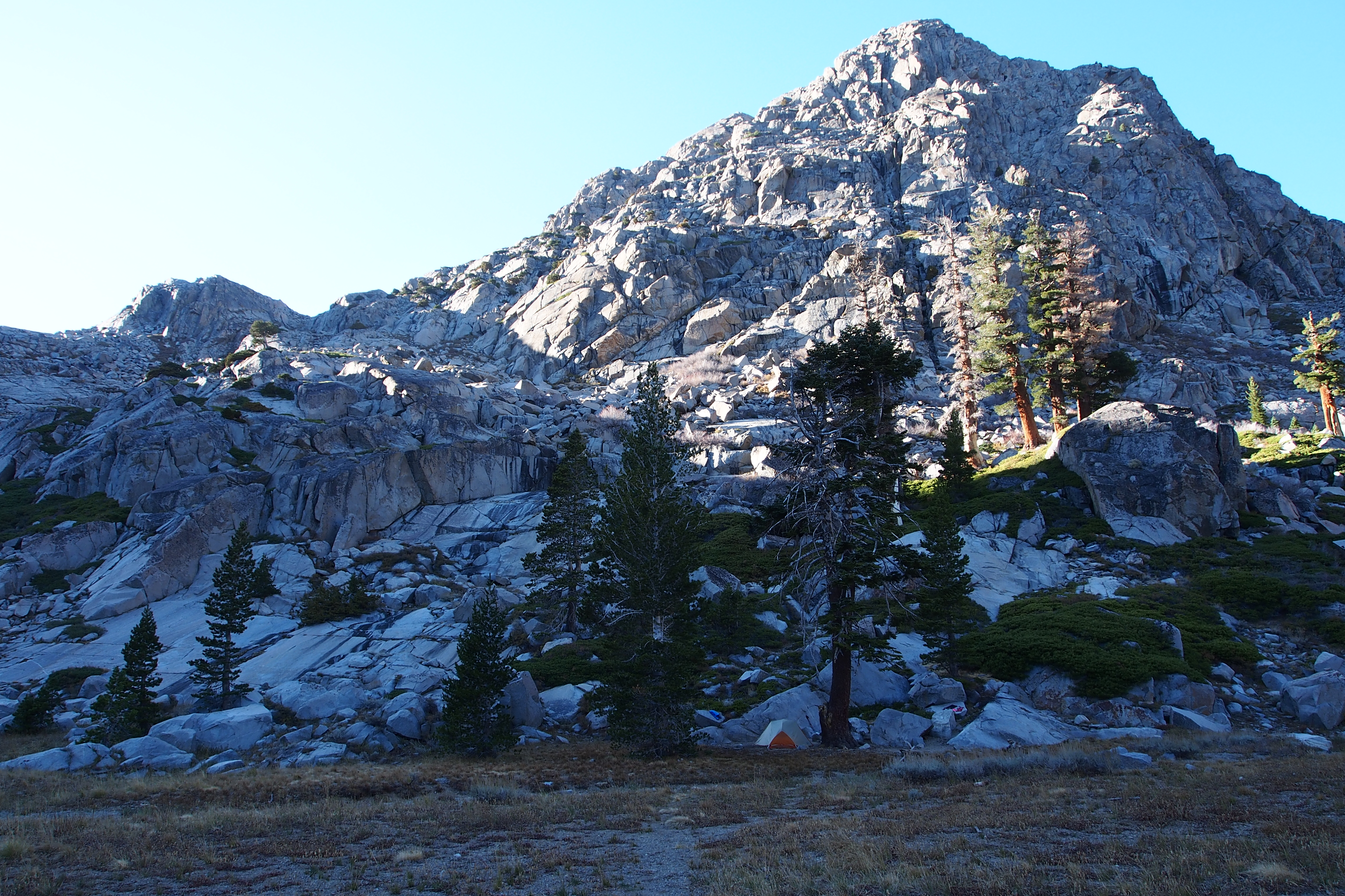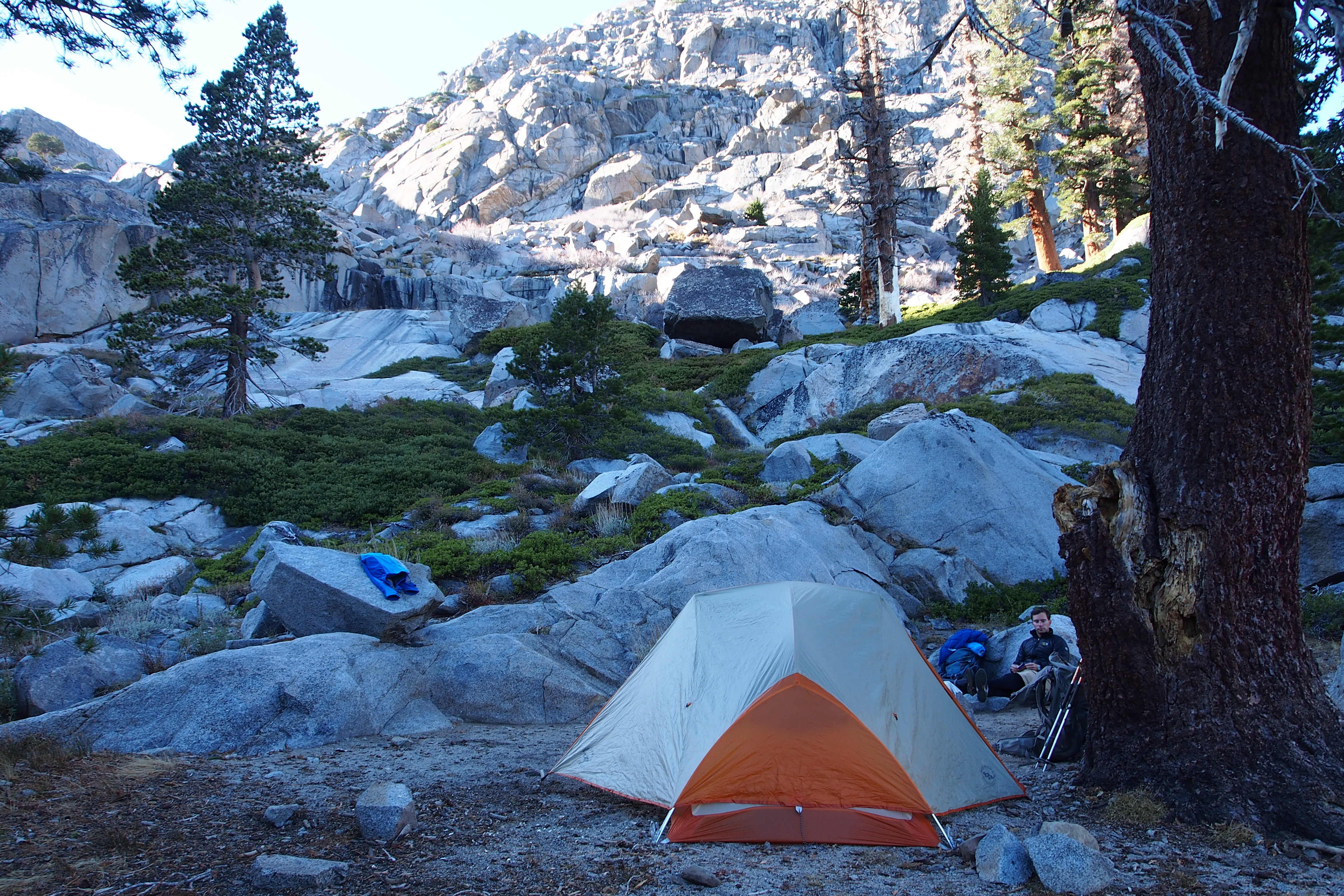 We made it to Fourth of July Lake around 2 or 3pm, plenty of time to wash off with a quick dip in the lake and dry off in the sun before it sunk below Fourth of July Peak. There are technically six labeled campsites (reserved via backcountry permit), but there was only one other group camping there that night and the sites are nicely spaced out around the lake, so we had a lot of privacy. We thought it provided pretty rad scenery and a great location for backcountry camping. It was cold, given the time of year, so we brought most of our winter gear, except the four season tent (not quite thaaaat cold yet, or so we thought). The sun sets early here since the lake is surrounded by high peaks on the west side, which made for an early night, but it came up early too so we were able to enjoy a nice sunny morning.