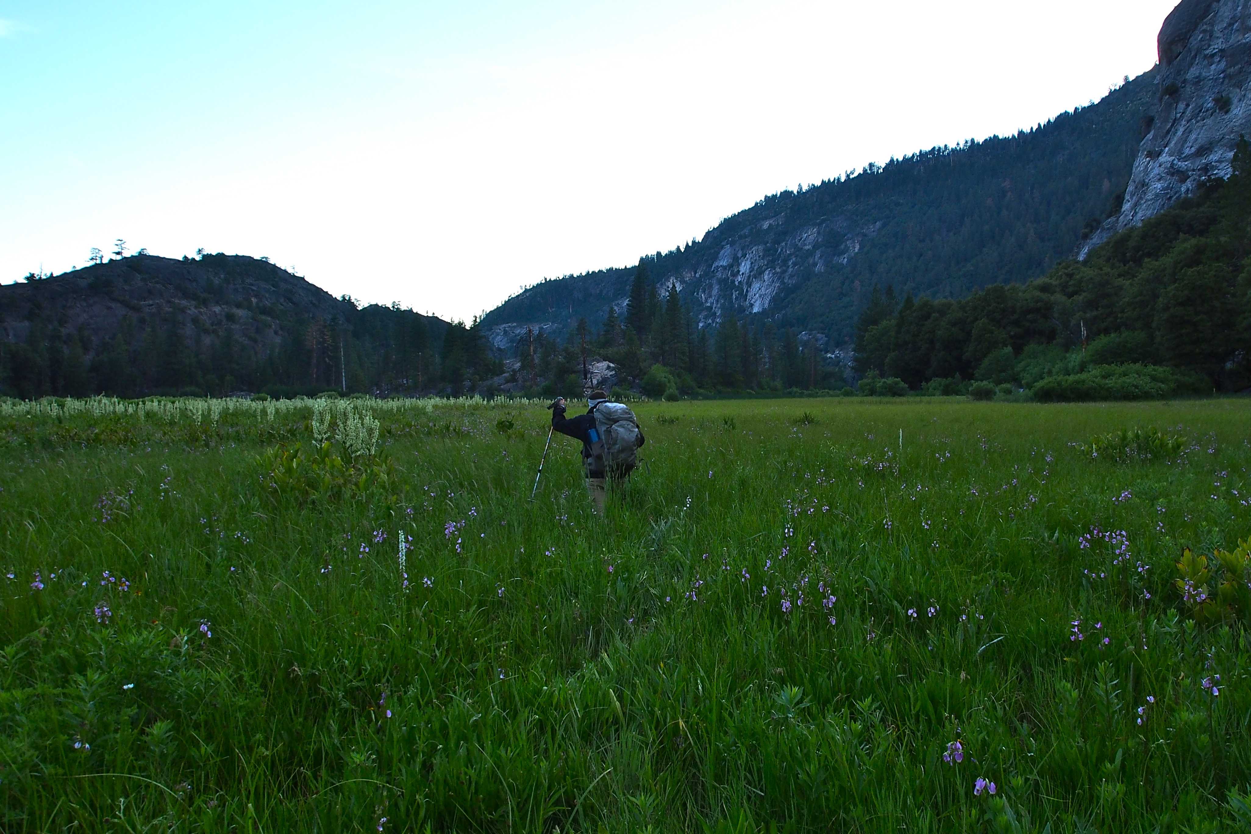 Given the hot day, and the fact that we had covered a lot of miles, some of which included running with our heavy packs, we were damn tired and thirsty by the time we reached Tiltill Valley. We had wanted to stop again to filter water up by Tiltill Mountain, but the mosquitos were so bad we had decided to just keep moving. However, the biggest shock of the day was that the lake pictured in Tiltill Valley on our map, was in fact just a lush green meadow and not a lake. We had expected it to be a small lake, but still, this was quite an unpleasant surprise since we were exhausted and running out of water. We were also hoping for another swim since we were COVERED in dead mosquitos.