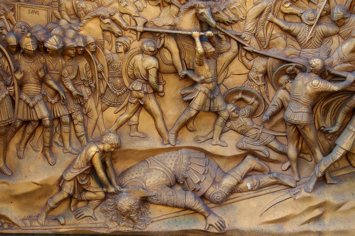 OLYMPUS DIGITAL CAMERA December 14, 2017 • 4608 × 3072 • Northern Italy: Tuscany, Cinque Terre, Venice, & the Dolamites The doors are sculpted to reflect biblical stories – David and Goliath can be seen here
